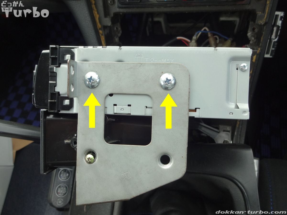 フレームの左右それぞれ2ヶ所ずつ(2DINサイズなら4ヶ所の場合あり)固定しているプラスネジを外せば、オーディオの取り外し完了。