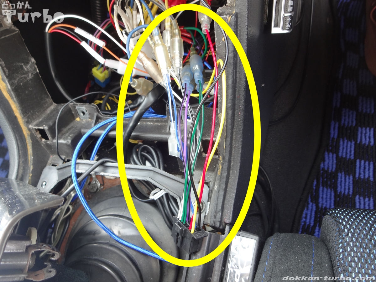 では、MVH-3600を取り付け…の前に、配線を。既に市販オーディオ用のハーネスがついているので、MVH-3600の配線につなぎ変えるだけ。