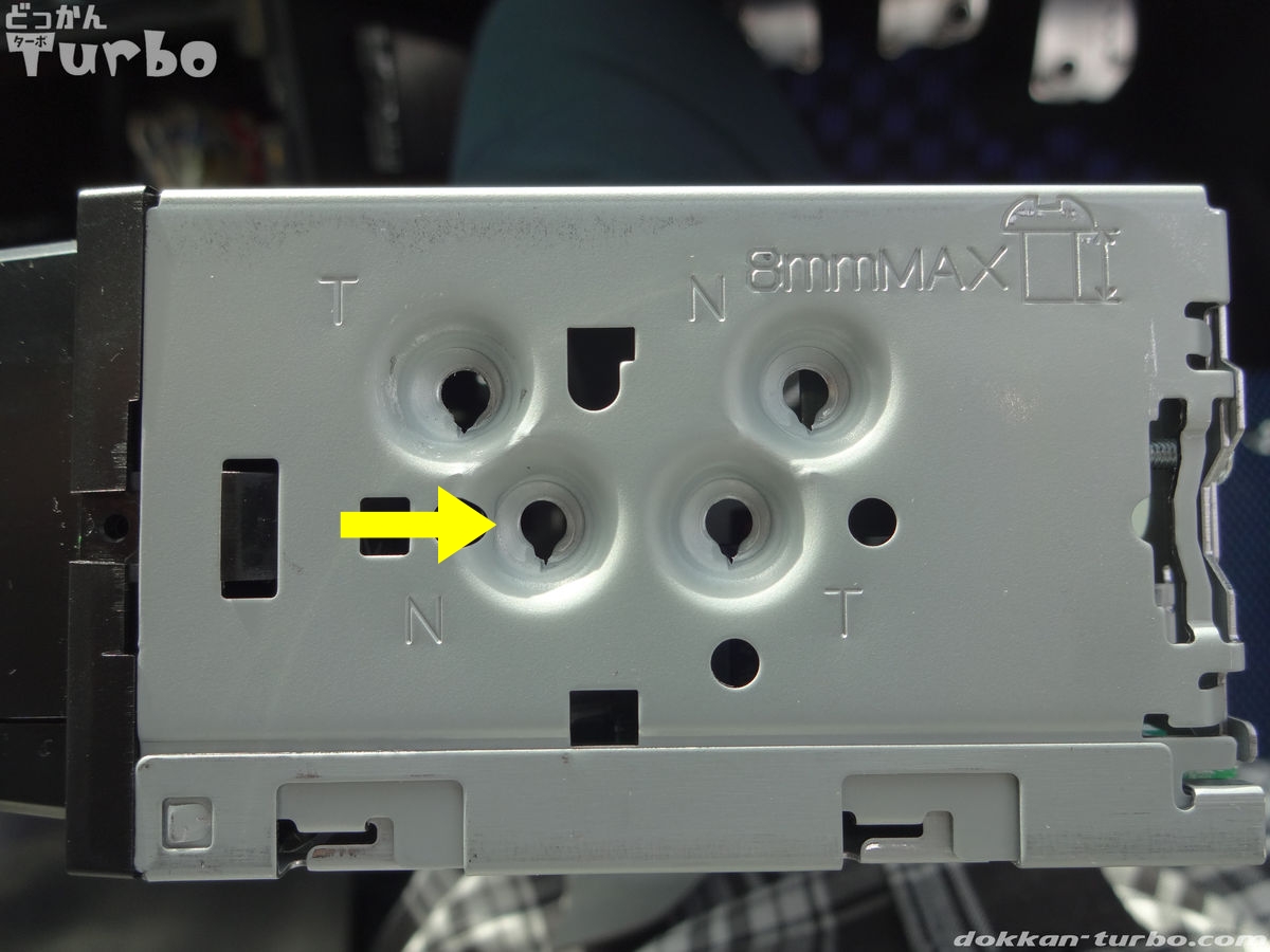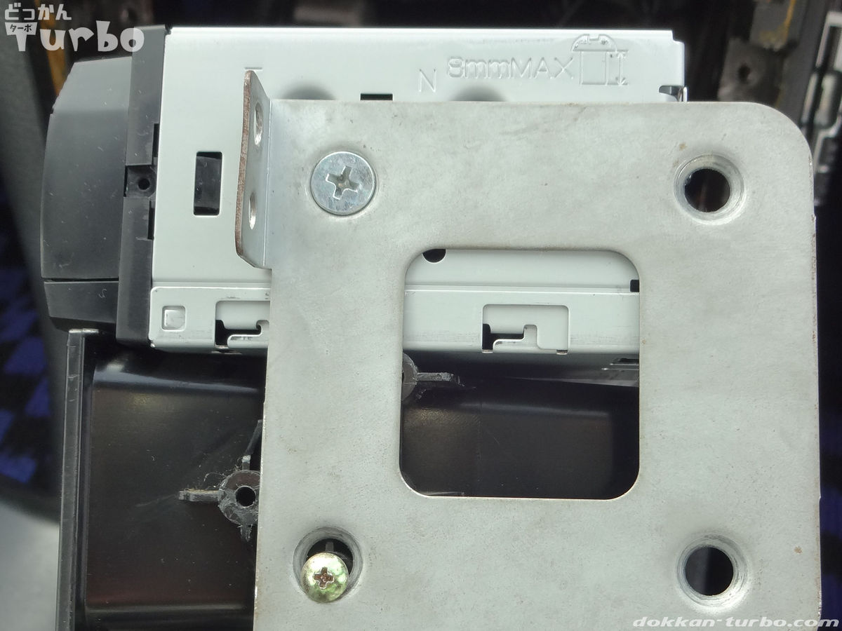先ほど古いオーディオを外したフレームに、MVH-3600を固定します。奥行きが短いので、180SXのフレームでは左右1ヶ所ずつでしか固定できませんでした。MVH-3600側は左下の「N」の穴(反対側は右下の「N」の穴)を使います。